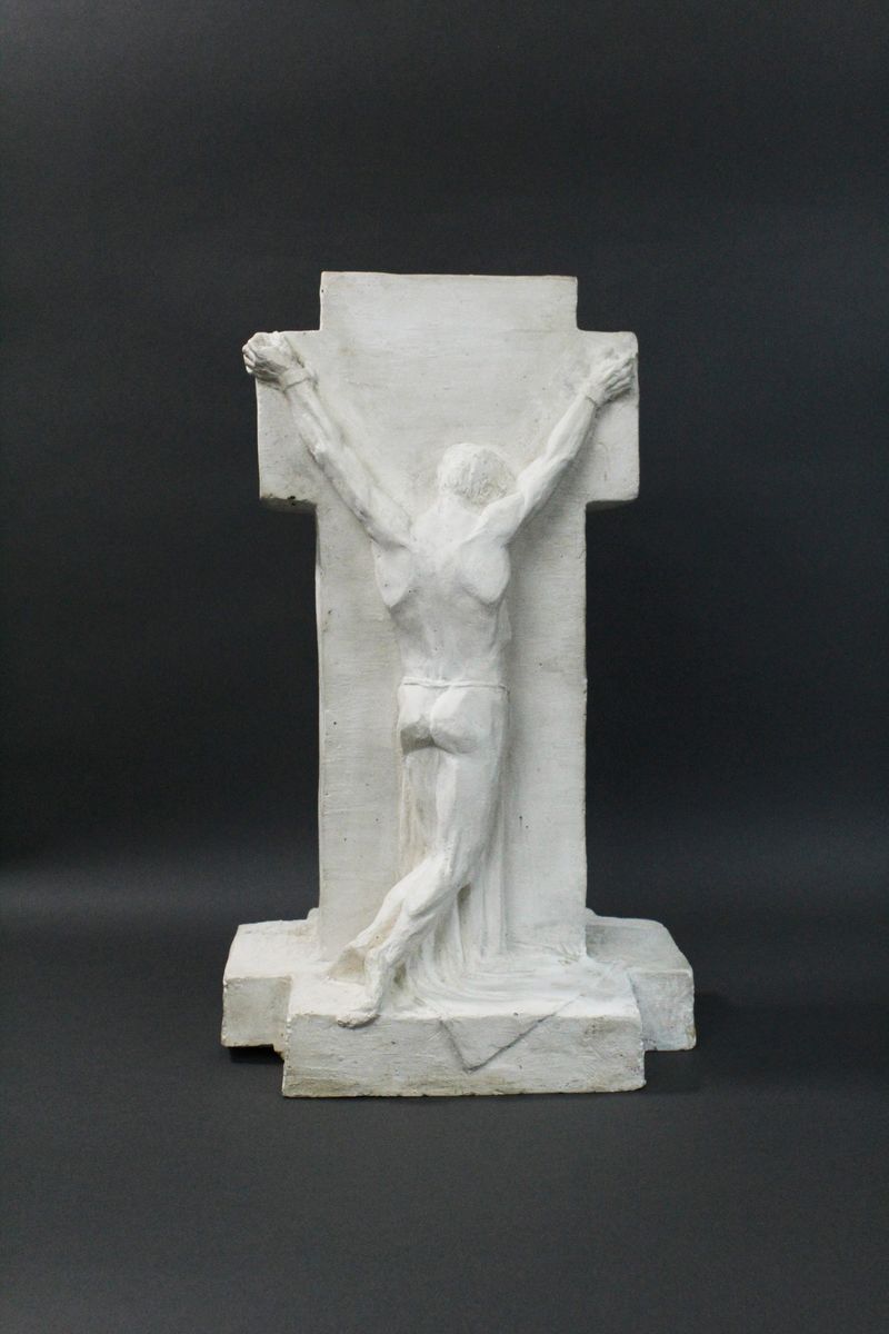 Statue of draped figure strapped to a vertical slab, with his back to the viewer. Proposal for international competition on the theme of "Unknown Political Prisoner."