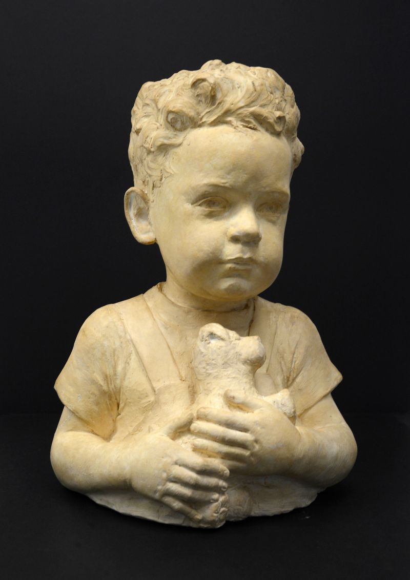 Son of Iowa State College music professor, Mr. and Mrs. Ira Schroeder. Plaster is of young boy holding a stuffed dog.