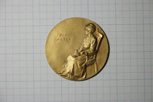 Petersen sculpts and casts a silver medal and bronze version, Min Moder (My Mother) as his earliest known three-dimensional medallic work of art.
